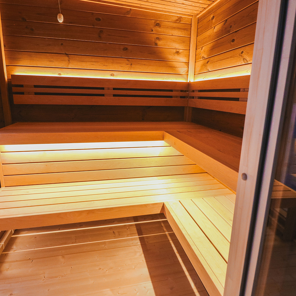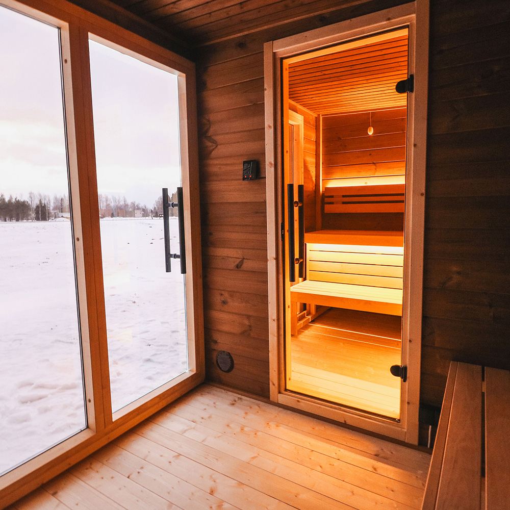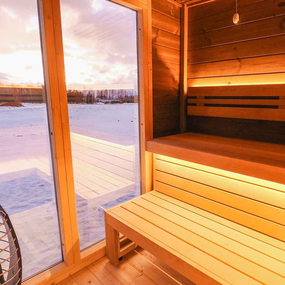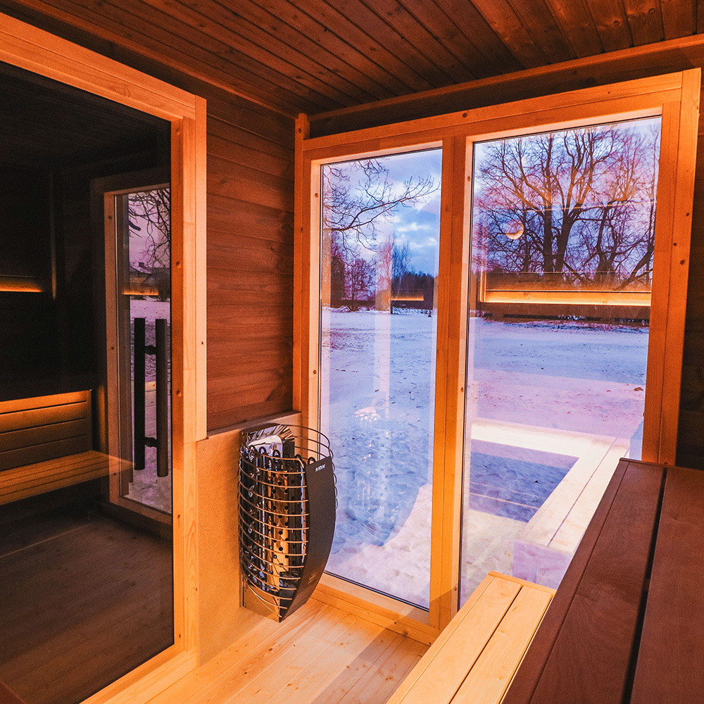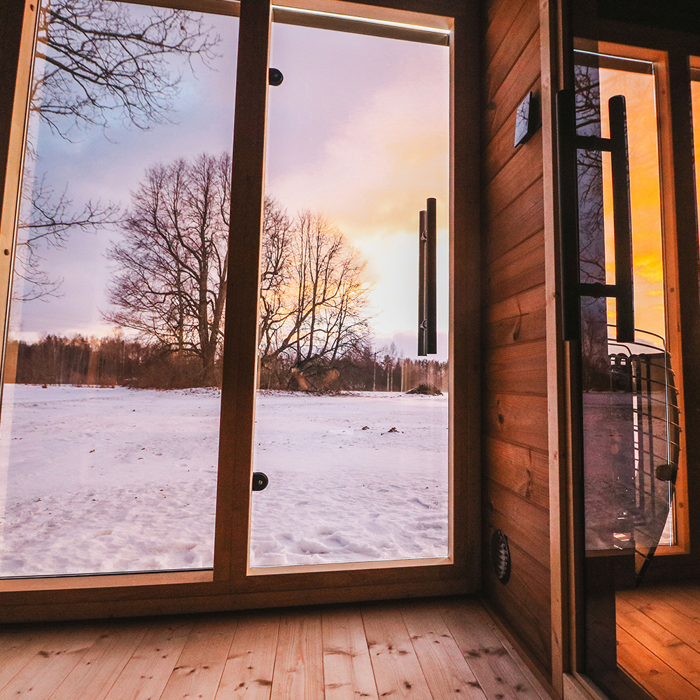 Przestronne wnętrze pomieści 5 osób, a duży przedsionek pełniący funkcję przebieralni zapewnia jeszcze większy komfort użytkowania. Nowoczesne przeszklenia dodają elegancji i pozwalają podziwiać otaczającą naturę podczas każdego seansu.